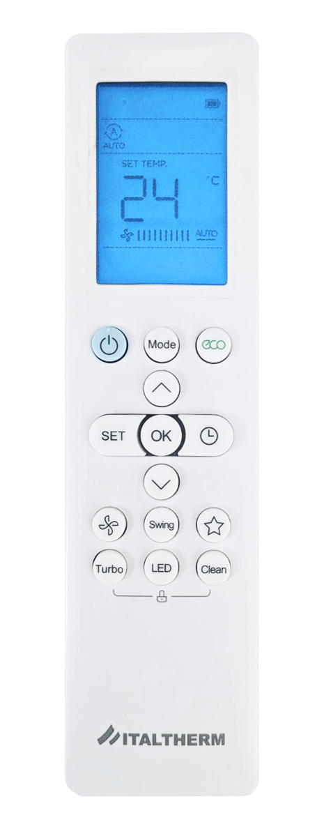 El mando a distancia de los acondicionadores de aire Italtherm está equipado con una pantalla intuitiva y ergonómica,